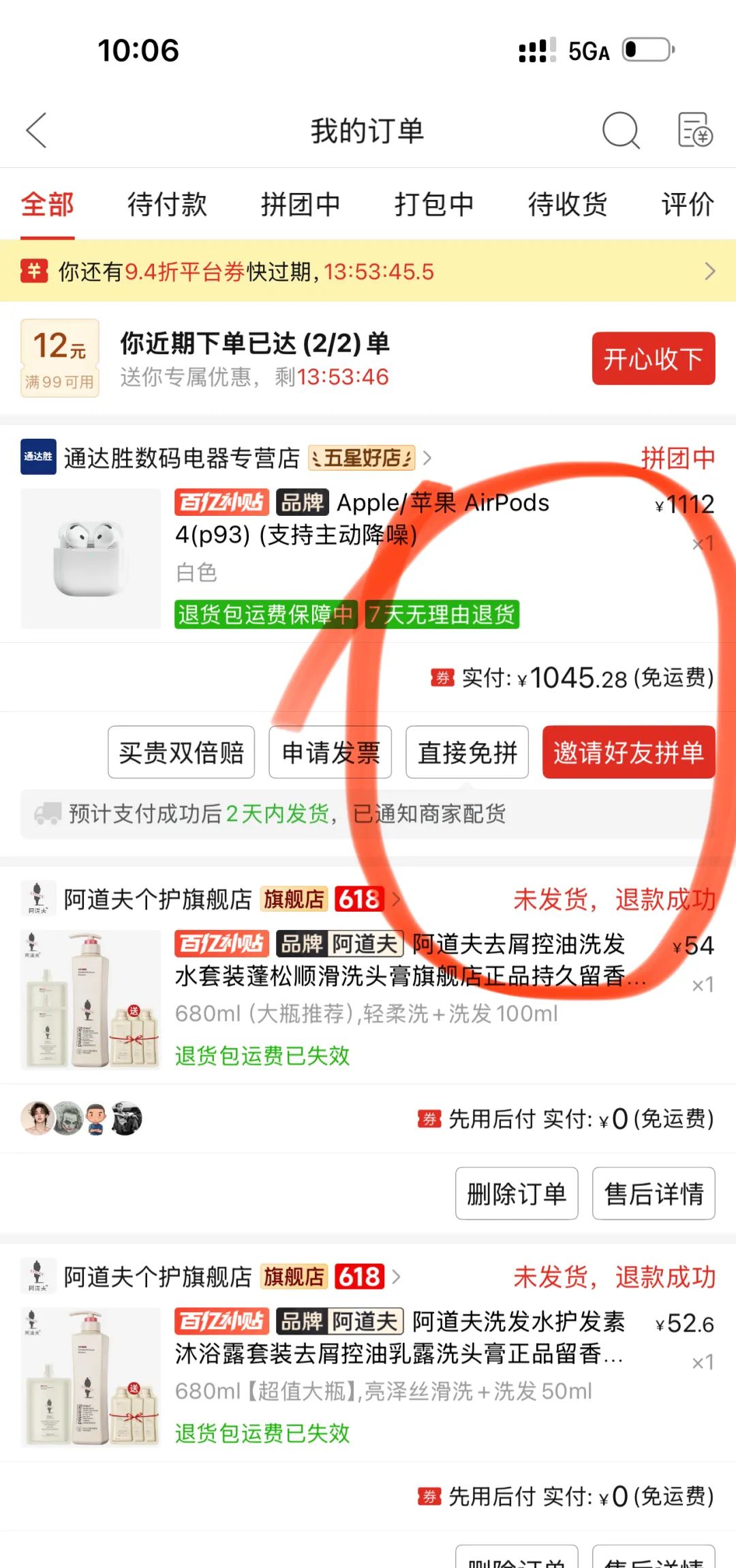 题外话,今天两次购物,比价后都是拼多多完胜:一次是AirPods 4降噪版,拼多多最终成交价1045元,京东国补后1249元,淘宝最贵1399元;另一次高露洁立式牙膏,拼多多24块包邮,京东25块+6块钱邮费。(当然,时而也会出现拼多多更贵的情况,但比例很低)