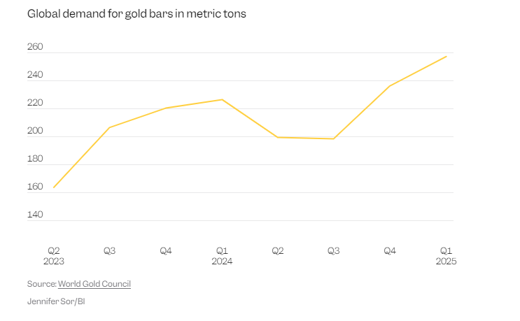 目前,黄金投资者在美国和海外不断涌现。世界黄金协会(World Gold Council)的数据显示,2025年第一季度,全球金条需求攀升至257吨,较上年同期增长13%。