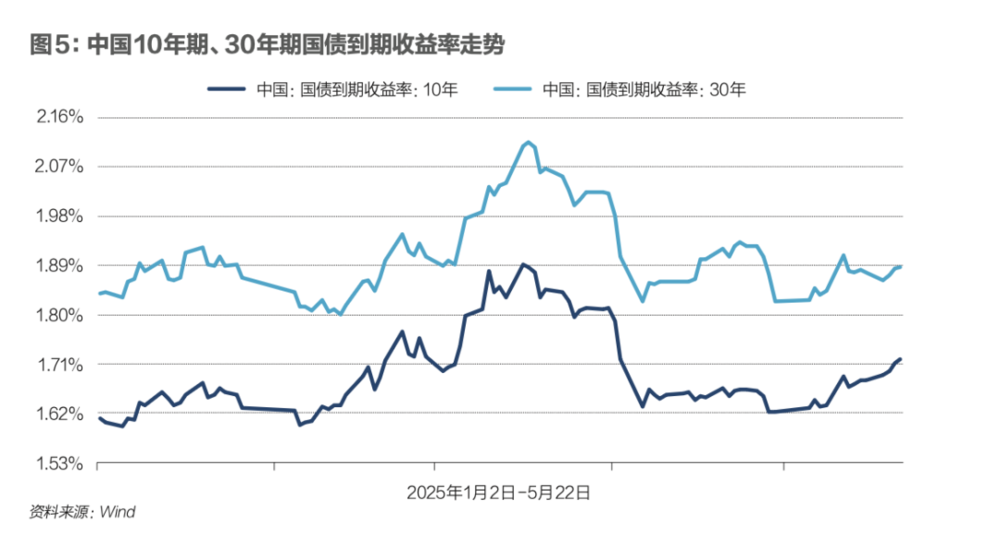 市场避险情绪降温,市场资金由债入股。截至当日收盘,国债期货全线下跌,30年期主力合约收跌1.31%。各期限国债收益率集体上行(对应债券价格下跌),其中10年期、30年期国债收益率分别上行超5个和7个基点至1.69%和1.91%,逼近4月初“对等关税”出台前水平。