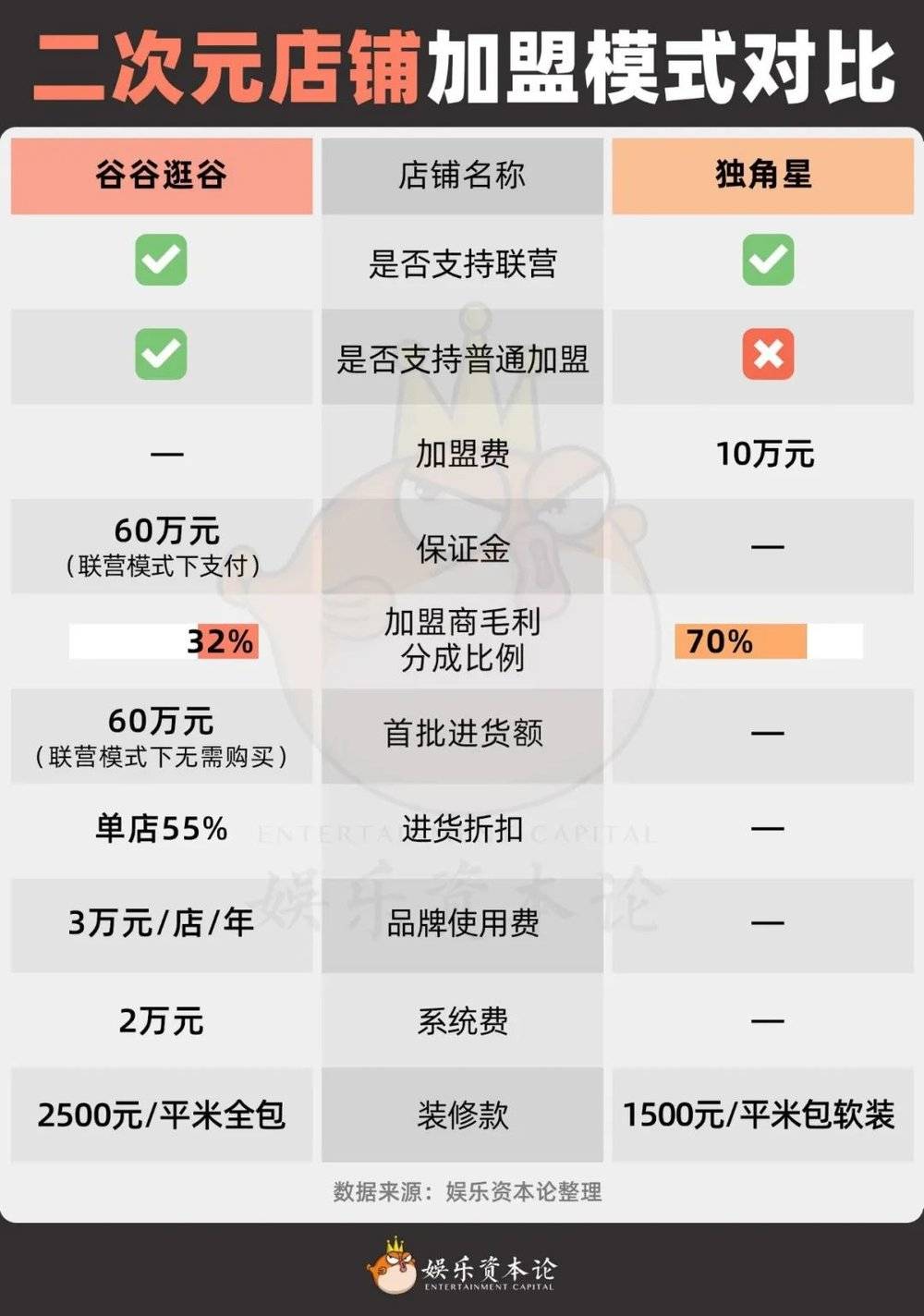 最近几年,二次元品牌越来越多地采用联合运营的加盟模式。比如二次元谷店连锁独角星,他们采用的就是联合运营模式。根据小娱的了解,独角星的运营费(加盟费)为10万元,合同期限为3年。3年之后,加盟商如果还想和独角星续期合作,则不需要收取运营费用。分成方面,独角星与加盟商的利润分成比例为3:7。