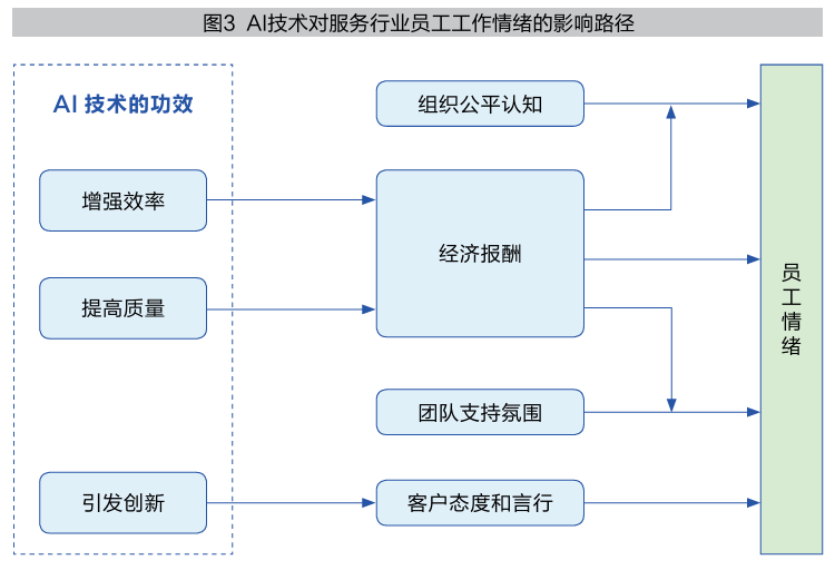 综上,AI技术可以通过多条路径影响一线员工的工作情绪,这些路径并不会直接作用于员工工作情绪。AI技术产生的功效对情绪的前置因素产生了影响,进而间接影响了服务行业员工的工作情绪。
