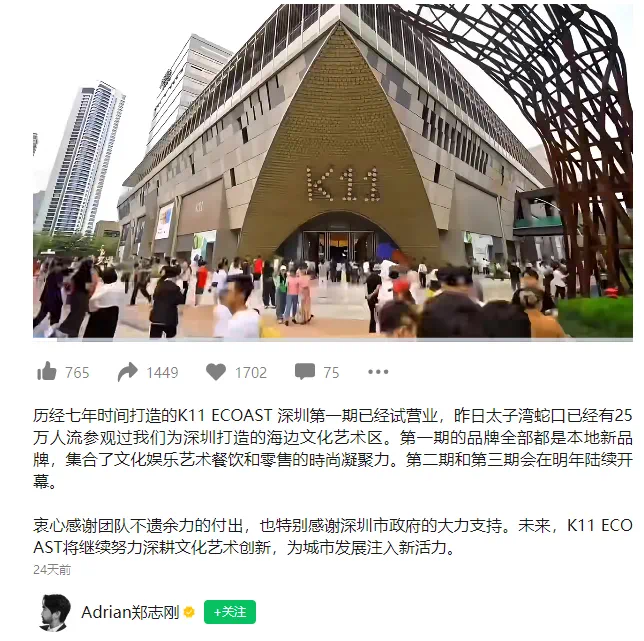 今年5月2日,郑志刚在其个人视频号上更新了深圳K11第一期试营业的视频,并且再次强调深圳K11“未来还会焕新”:“第一期品牌全部都是本地新品牌,集合了文化娱乐艺术餐饮和零售的时尚凝聚力。第二期和第三期会在明年陆续开幕。”