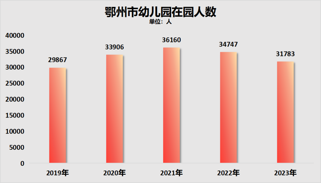 鄂州幼儿园在园人数2021年见顶,2022年减少了1413人,2023年减少了2964人,两年合计减少了4377人,相比于2021年,下降了12.1%。