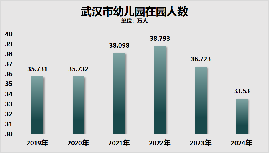 武汉幼儿园人数在2022年见顶,当年38.793万人,2023年降至36.723万人,去年降至33.53万人。两年减少了5.263万人,降幅13.57%。