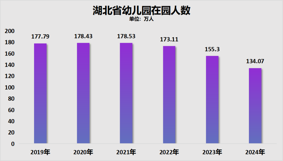 整个湖北省的幼儿园在园人数从2021年的178.53万人降至2024年的134.07万人,三年减少了44.46万人,降幅24.9%,也即三年减少了四分之一。