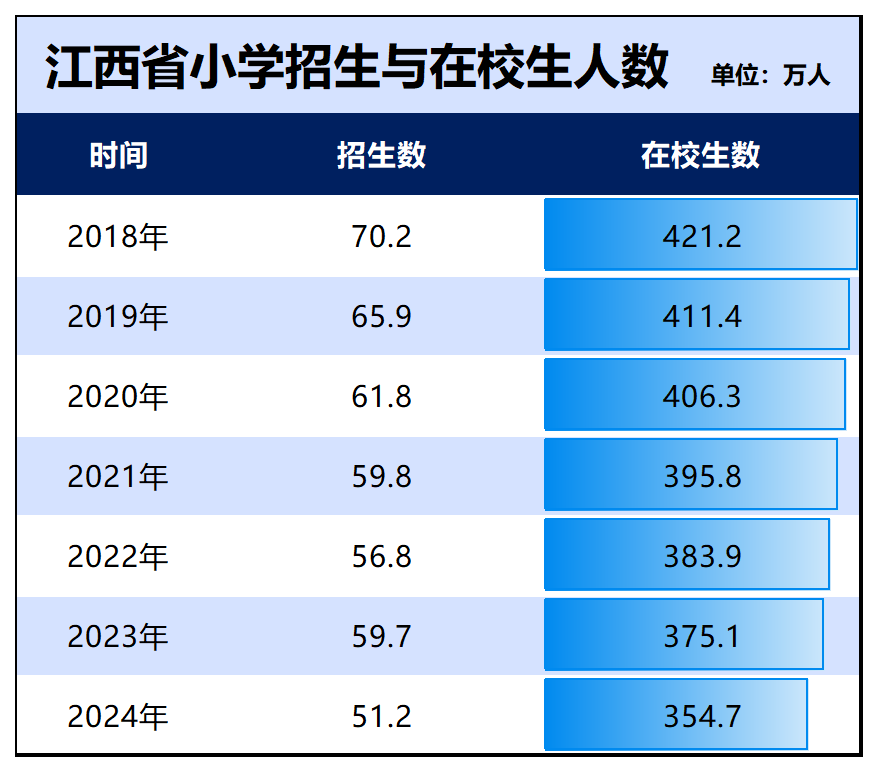 江西统计局披露的小学生数据来看,无论是招生人数,还是在校生人数,这几年一直都在减少。