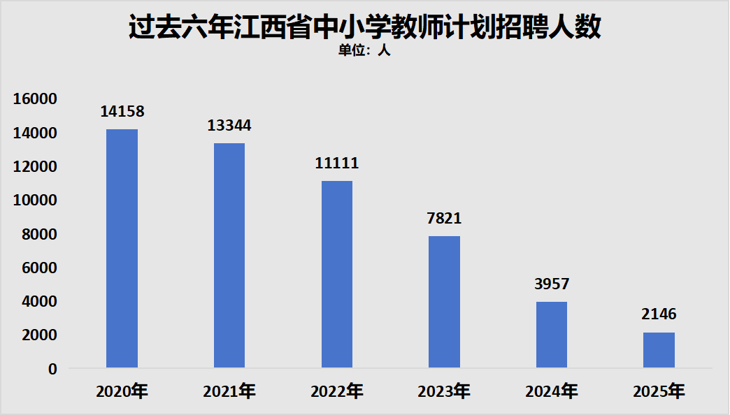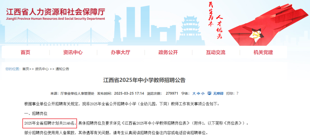 今年3月25日,江西省人力资源和社会保障厅官网披露:2025年江西省中小学教师招聘人数计划2146名。