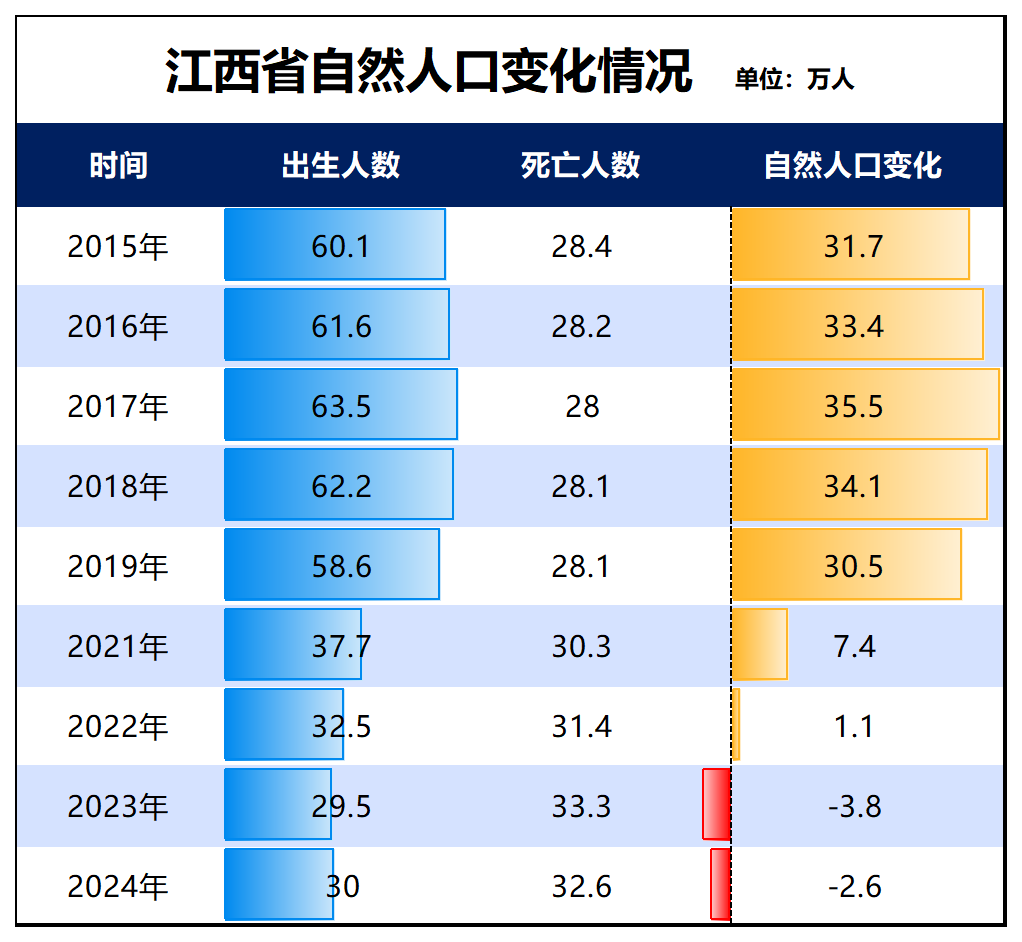 自然人口方面,江西省出生人口2017年见顶,和全国大趋势同步。2023年江西省自然人口首次减少,当年减少了3.8万人,去年减少了2.6万人。