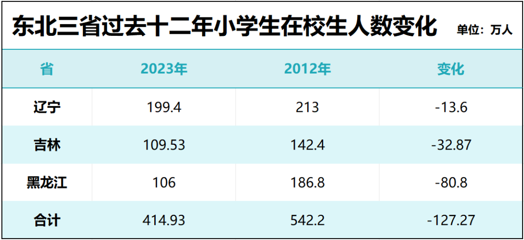 东北三省过去十二年小学生合计减少了127.27万人。