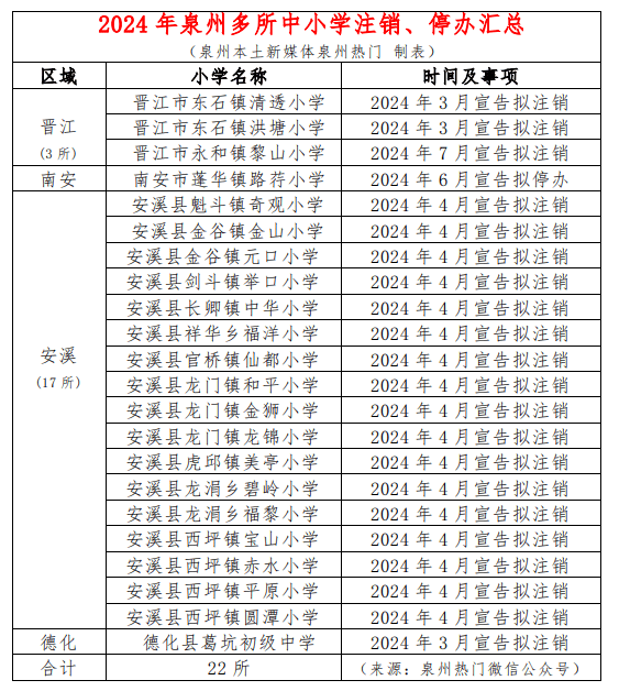 2024年7月,泉州有22所小学发布了注销公告。