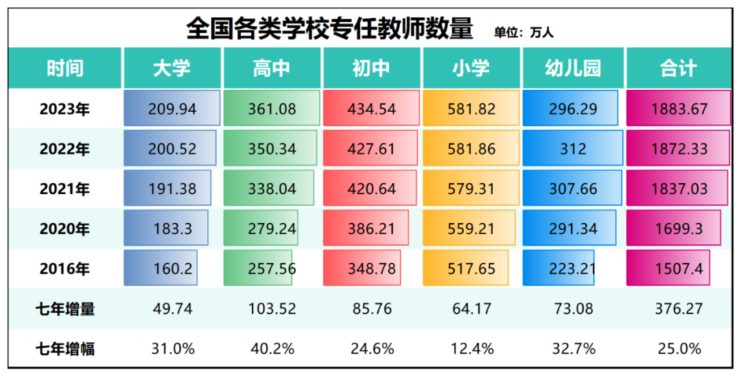 不计算特殊教育、中等职业教育、成人教育、专门学校等专任教师,所有大学、高中、初中、小学、幼儿园的专任教师,2023年合计1883.67万人,同口径下较2016年增加了376.27万人。