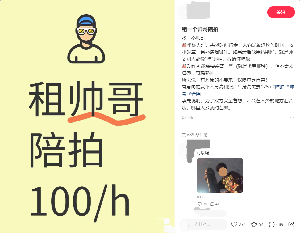 毕业季来临,不少即将毕业的女大学生们开始在小红书上招募帅哥“有偿陪拍”,必备条件大多是“180大帅哥”“单身”“最好是直男”,和女孩们拍些情侣姿势的合影,给出的报酬一般在100元~200元每小时,拍开心了女生也可以请吃饭。