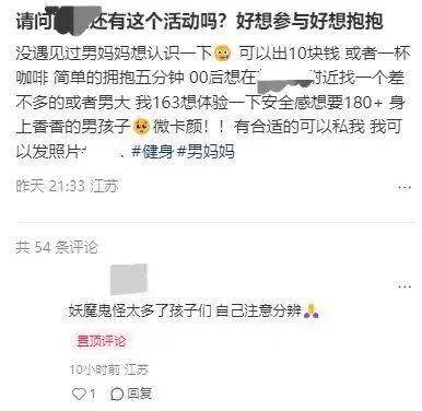 所谓“拼好抱”,就是在小红书上付费寻找肌肉男,双方来上一场拥抱。最初由一位小红书用户发帖称想“花50租个男妈妈拥抱5分钟”,该用户称自己最近压力大,想付费找人“被圈起来抱得紧紧的”,只抱5分钟,抱完就各回各家。