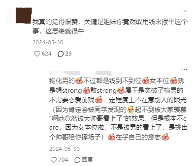 但这位小红书用户在发帖时就早已大方承认自己的“虚荣心”,称自己“大学四年没谈过,就是要strong(死装的英文谐音)一下”。评论区也有不少网友表示支持,认为“想strong,敢strong,本质是不在意他人眼光”,也有人认为,这是“女本位”的做法。“不是被男的看上了,而是付费挑个帅哥陪你出场,只在乎自己的意志。”