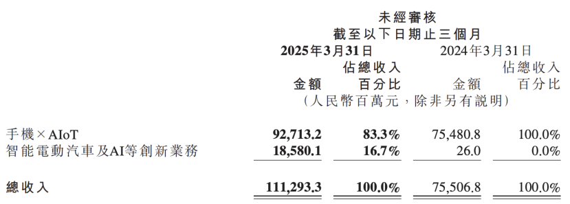 受益于汽车销量的不断攀升,2025年第一季度,小米智能电动汽车及AI等创新业务分部总收入186亿元,其中,智能电动汽车收入181亿元,其他相关业务收入5亿元。