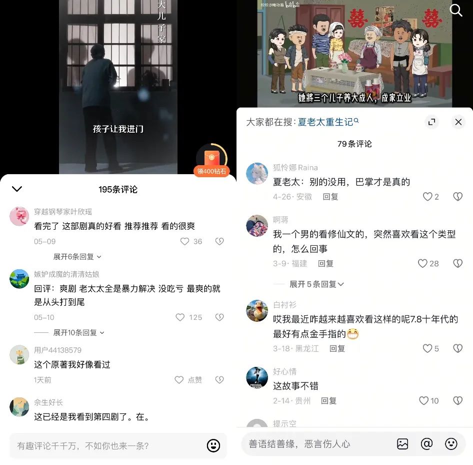 对老年观众来说,老年人不再在重生故事中担当配角,而是也能体验一把主角的金手指,打脸虐渣、发家致富。尤其在这些重生文的共性爽点之外,年代背景还赋予了更多。