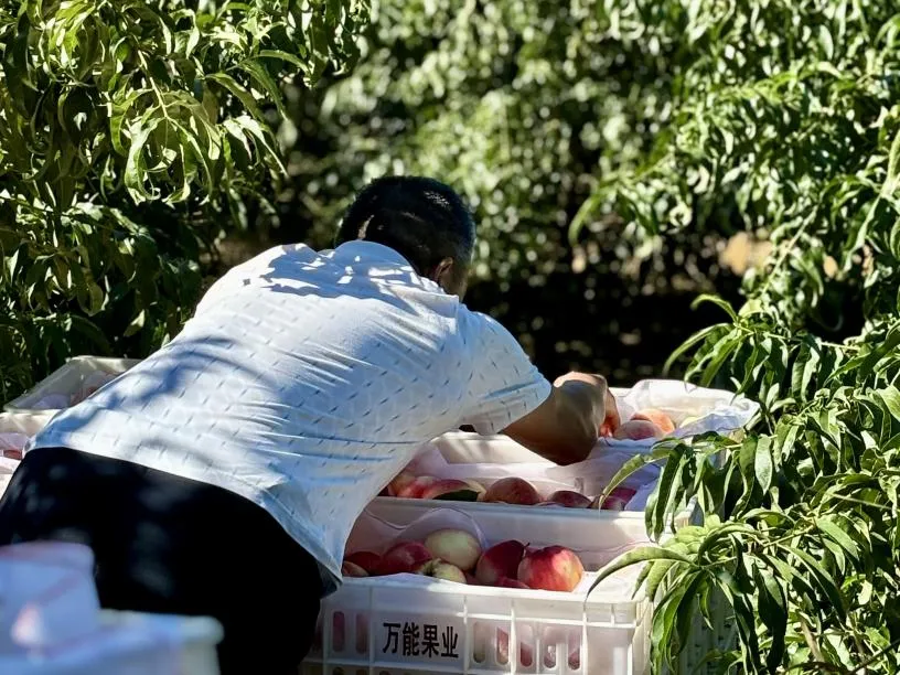 2024年夏天,崔君回老家,去桃园帮父母收桃子。年近60岁的父亲种了1000多棵桃树,种桃子是一项艰辛的劳动。赶上桃子集中成熟,他们要凌晨两三点戴头灯去摘,以便赶上清晨发运的货车。这一次回去,崔君注意到,装桃子的周转箱上有“万能果业”的红漆字,是桃贩老板印上去的,以防箱子混淆或丢失。
