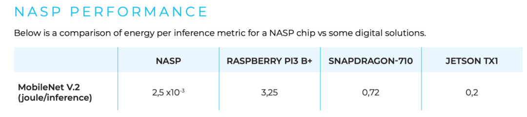 这款芯片实现了超低功耗和实时信号处理能力,在执行信号推理时的功耗低于100μW,某些应用场景如NeuroVoice VAD模型甚至可降至30μW。如此低的能耗使其非常适合应用于耳机、可穿戴设备、智能轮胎以及预测性维护传感器节点等功耗受限的环境中。此外,NASP可将原始数据量缩减高达1000倍,显著提升隐私保护水平,减少对云服务的依赖,尤其适合医疗健康等对数据安全要求极高的领域。在技术资料中,NASP放出了在推理MobileNet V.2时候对比树莓派3B+和JETSON TX1的结果。