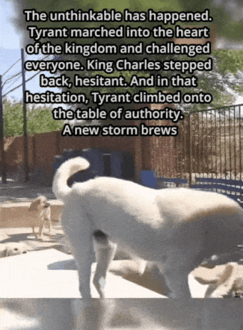 “不可思议的事情发生了,暴君闯进了王国的腹地挑战所有的狗。查尔斯国王犹豫着后退了,而暴君犹豫了一下便爬上了权力之桌。一场新的风暴正在酝酿。”