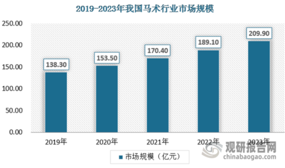 观研天下报告显示,近年来,我国的马术行业市场规模不断扩大,2023年达到209.9亿元规模。同期马术行业相关俱乐部达到了2456家,马术行业会员数量超过67万人。