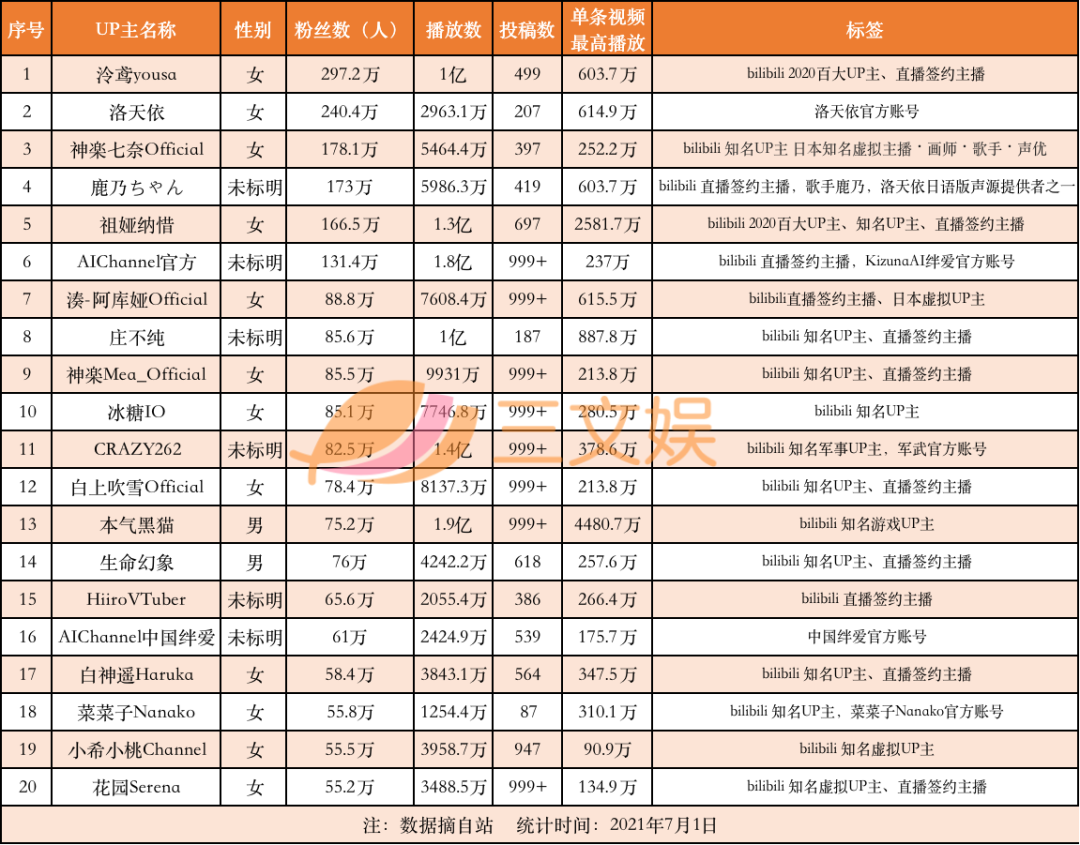 因此,三文娱对这24周上榜的虚拟偶像做了一个统计: