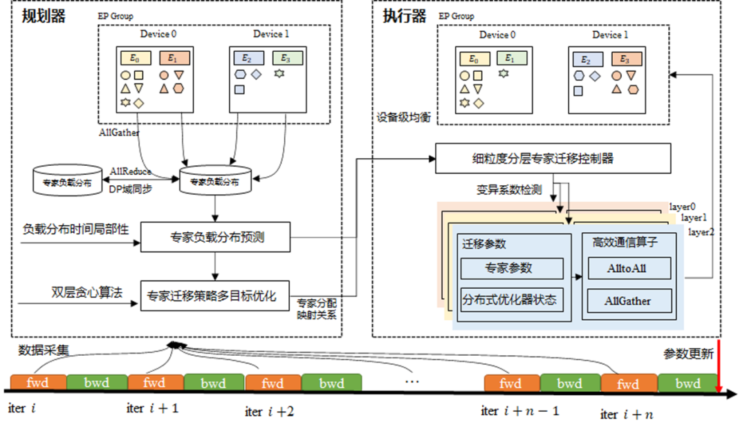 All-to-All通信瓶颈:专家并行架构需要进行大规模的token路由交换,这不仅占用大量网络带宽资源,还会造成计算资源长时间空闲等待,严重影响整体训练效率。