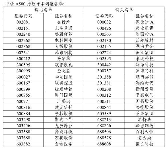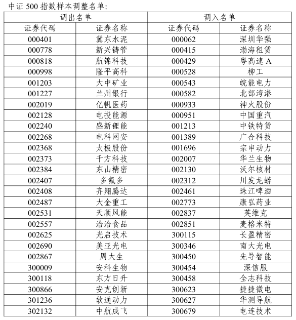 中证500指数更换50只样本,恒玄科技、百济神州等调入指数;冀东水泥、新兴铸管等调出指数。