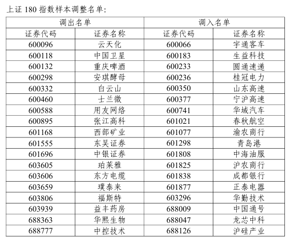 上证180指数调整18只样本股,宇通客车、生益科技、圆通速递等调入指数;云天化、中国卫星、重庆啤酒等调出指数。