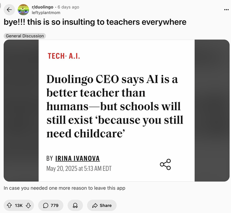 三周前,CEO Luis von Ahn刚刚宣布公司将转向“AI-first”战略,计划用人工智能逐步取代承包商。消息一出,社交媒体炸开了锅。“Mama,may I have real people running the company?”这条评论获得了69,000个赞。用户们开始删除app、取消订阅,有人甚至录制视频,亲手终结了1500多天的连续学习记录。