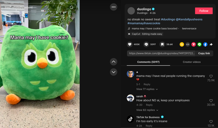 邮件公开后48小时内,Duolingo的社交媒体评论区彻底沦陷。在TikTok上,一个播放猫头鹰玩偶问“Mama,may I have a cookie”的趣味视频下,最高赞评论变成了“Mama,may I have real people running the company”,获得了超过75000个赞。