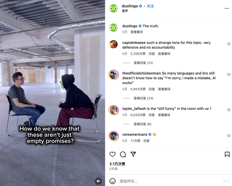 正是在这样的背景下,5月17日,Duolingo做出了那个看似“聪明”的决定——清空所有社交媒体内容。官方说法是“探索沉默的力量”,但时机如此巧合,明眼人都看得出这是转移焦点的策略。