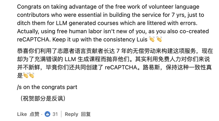 眼看神秘营销失败,5月22日,Luis von Ahn不得不亲自出镜,与“反抗者”展开对话。但整个对话避重就轻,当被问到“还会有人类员工吗”时,他强调“我们会继续雇佣员工”,却对承包商的命运只字不提。