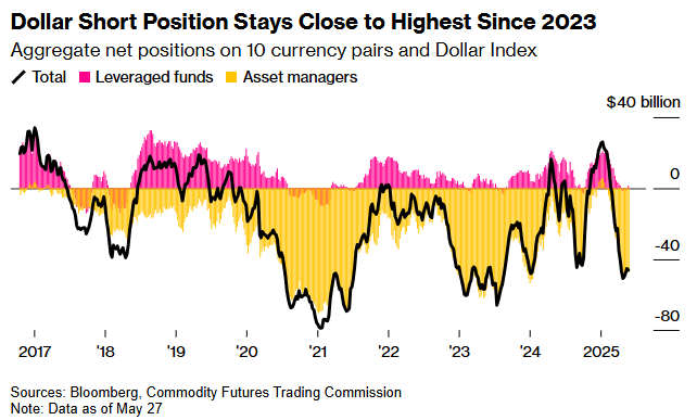 美国商品期货交易委员会的持仓数据显示,目前市场人士对美元的看跌情绪还远未达到极端水平,这凸显出美元未来可能仍面临巨大的下行压力。