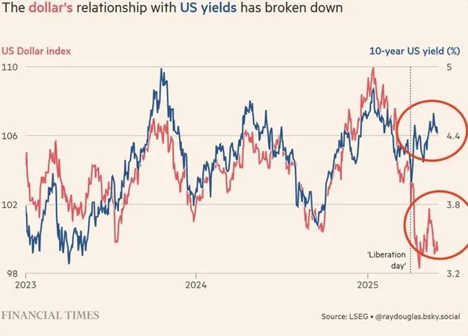 然而,自今年4月初特朗普宣布其“解放日”关税以来,10年期美债收益率虽已从4.16%升至4.42%,但美元兑一篮子货币美元汇率却下降了4.7%。上月,美元汇率与美债收益率之间的关联性降至近三年最低水平。