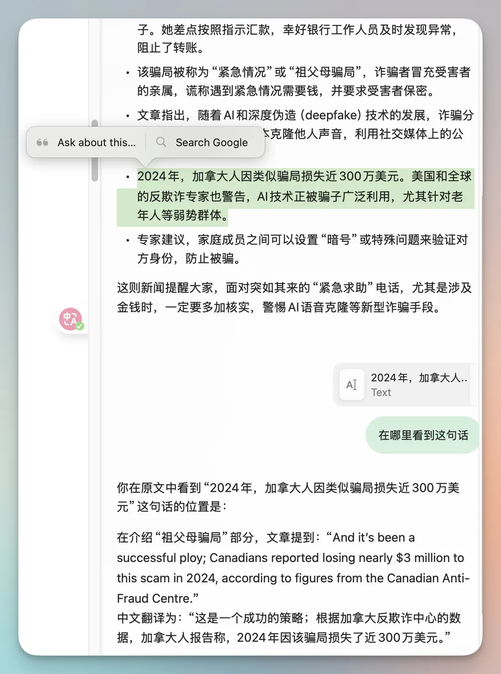 你可以划线,然后在弹出气泡中选择继续提问还是谷歌搜索。