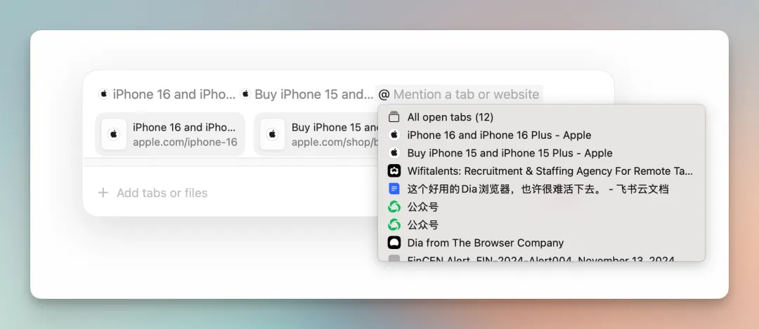 我可以分别点开他们的网页,然后在 Dia 的搜索框内,手动@这两个标签页,说对比。