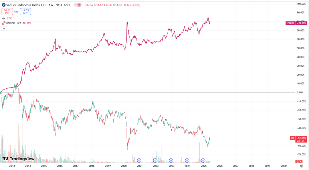 上图展示的是新兴市场的一个小分支,其实印尼本币计价的股票过去走势是没问题的,但美元对印尼盾升值了80%。那自然IDX或者EIDO跌成狗了。