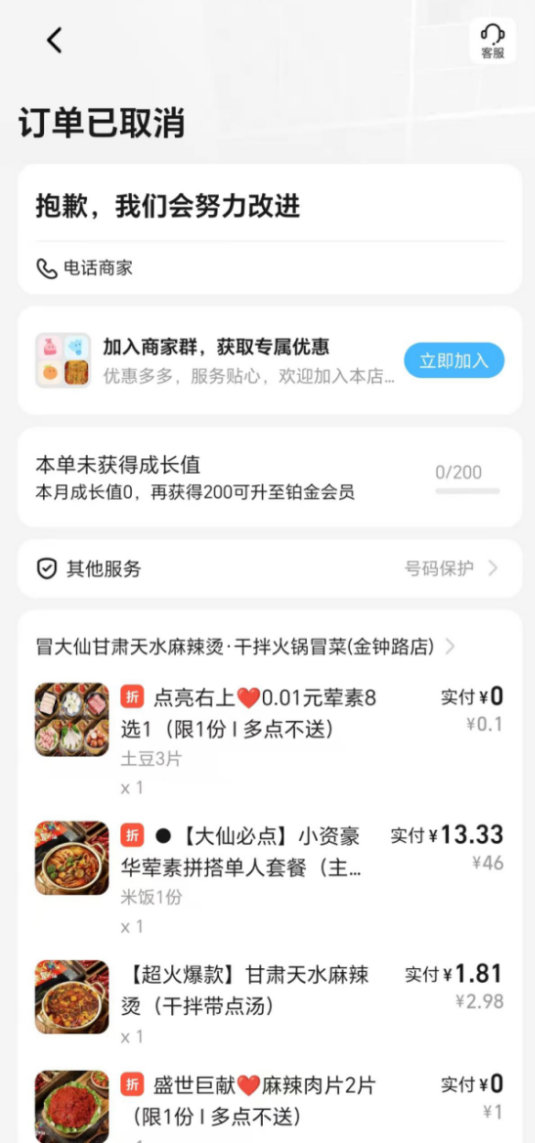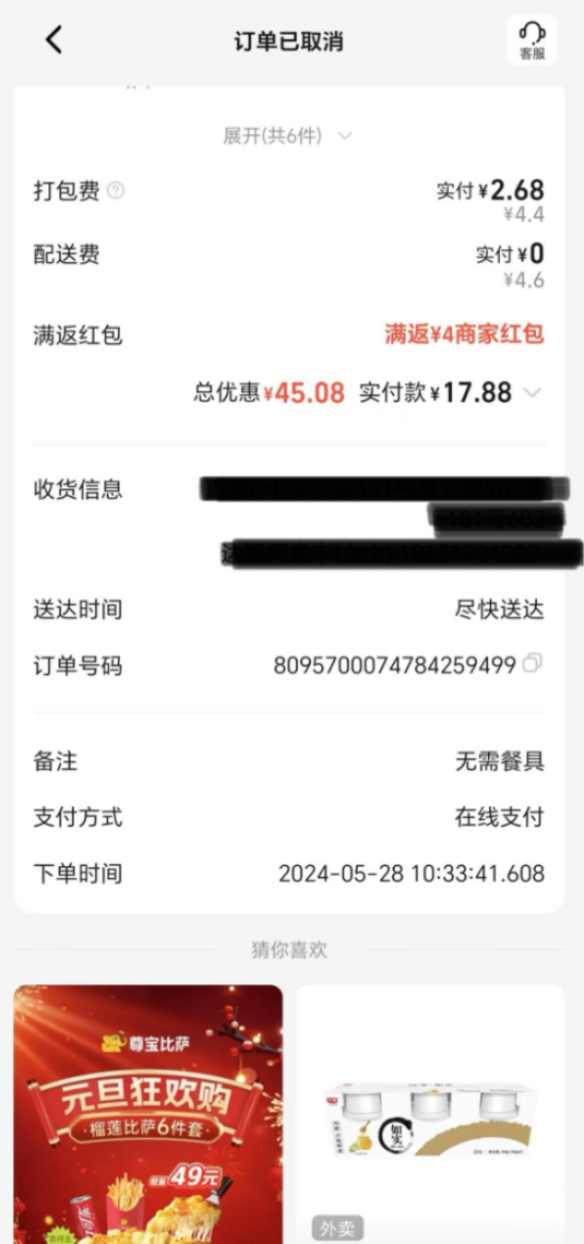 除了失窃,外卖配送中还会出现配送错误和超时等问题,往往更加复杂。“印象很深的是,有一次外卖竟然超时半小时。”同在上海的大学生的欧阳接受采访时谈道。对此,她的处理方式是取消订单,并收到了相应的退款。但这种情况下,她并不能直接从页面信息中得知这笔退款的来源是外卖平台(饿了么)还是商家。