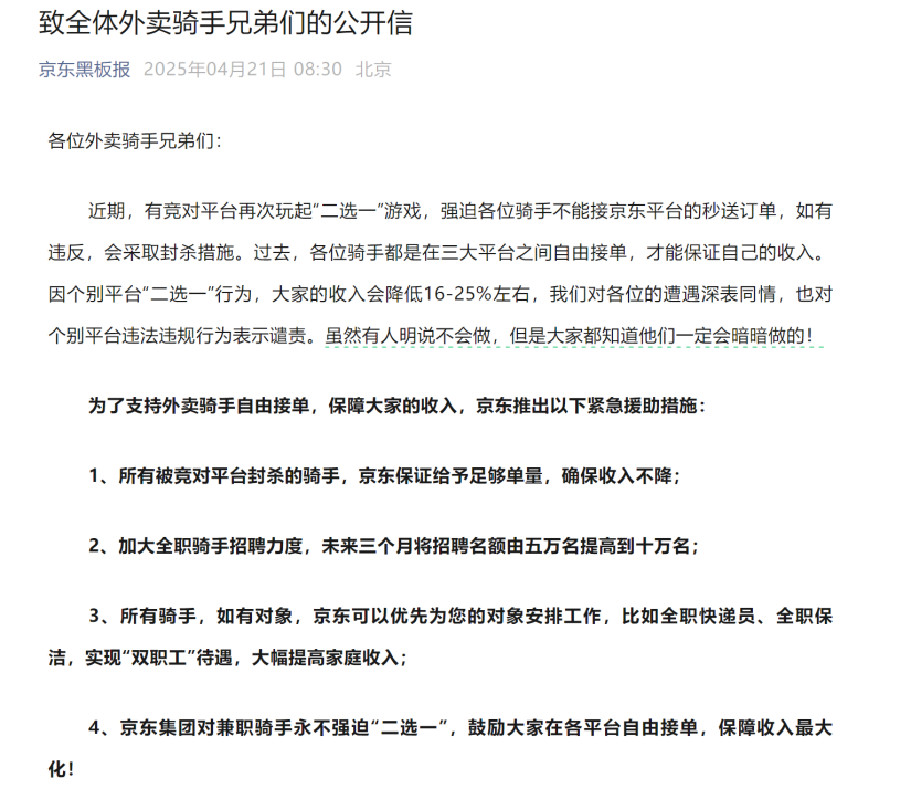 京东在2025年4月21日发布《致全体外卖骑手兄弟们的公开信》(图源:京东黑板报微信公众号)