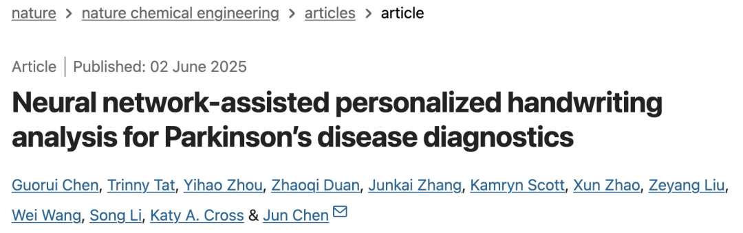 相关研究论文以“Neural network-assisted personalized handwriting analysis for Parkinson’s disease diagnostics”为题,已发表在 Nature 子刊 Nature Chemical Engineering 上。论文通讯作者为加州大学洛杉矶分校(UCLA)的生物工程系终身教授、生物电子实验室创始人 Jun Chen。