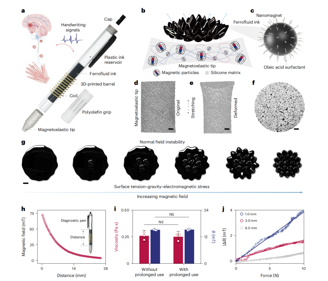 据论文描述,这款诊断笔主要由磁弹性笔尖和铁磁流体墨水两部分组成。笔尖中的磁性颗粒嵌入硅胶基底,可感知书写过程中的压力变化并产生磁场,而铁磁流体墨水对这些磁场变化产生响应,进而生成可记录的电压信号。