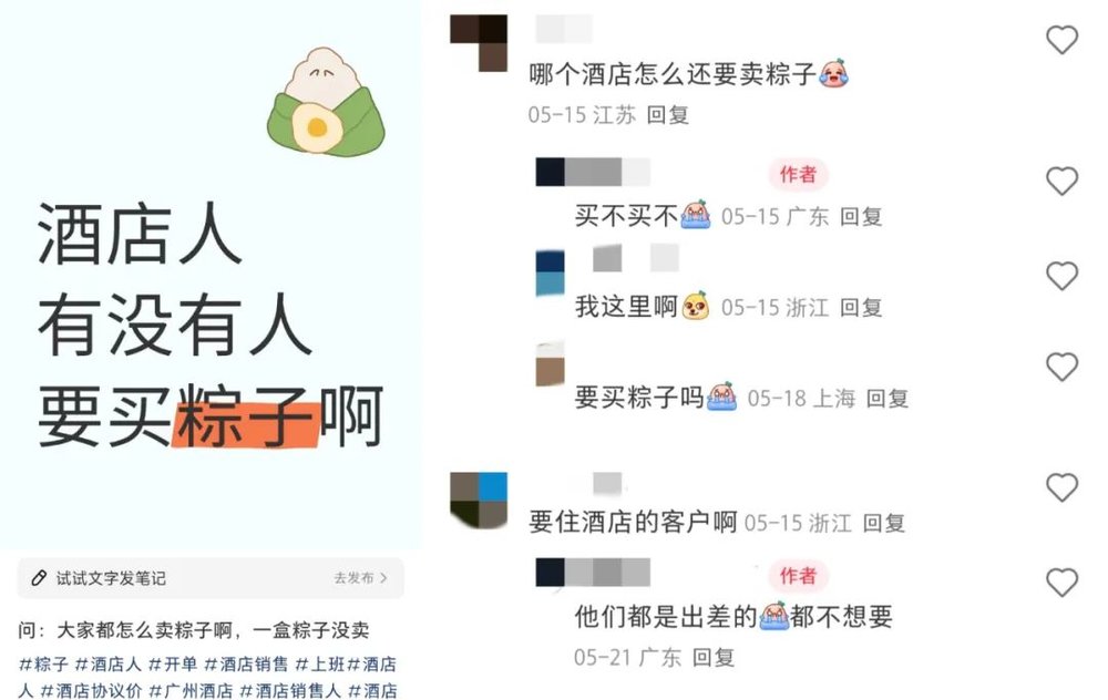社交媒体上,卖粽子的酒店员工今年从3、4月份就开始哭爹喊娘,不知道要怎么把粽子卖出去。