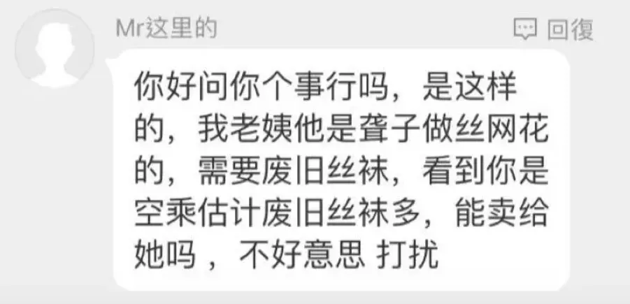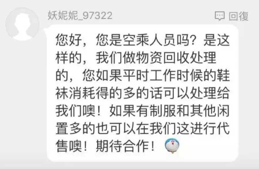 作为乘务员,哪怕工作再苦再累,职业尊严是大家都认可的。可就是这帮人,三块五块一双袜子地喊价,千把块钱收丝袜地钓鱼,生生把我们拽到一个最恶心的泥潭里。