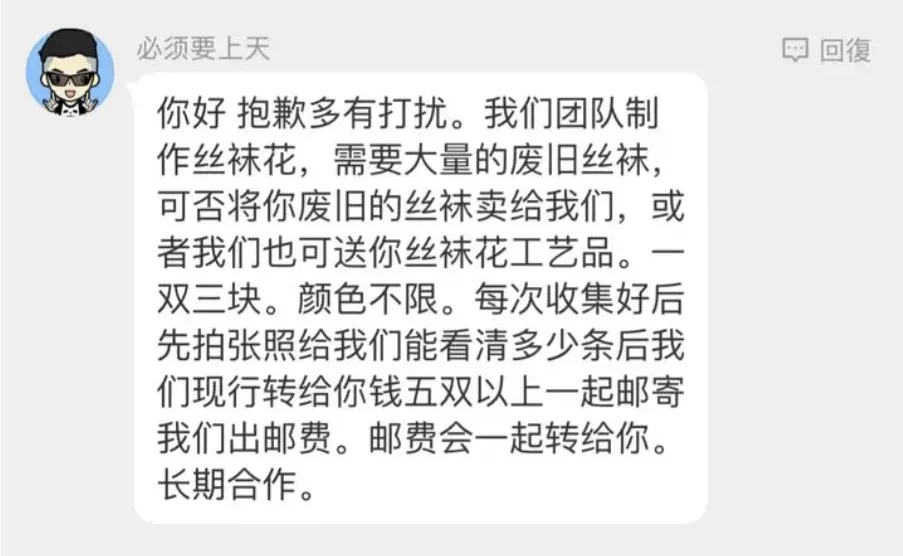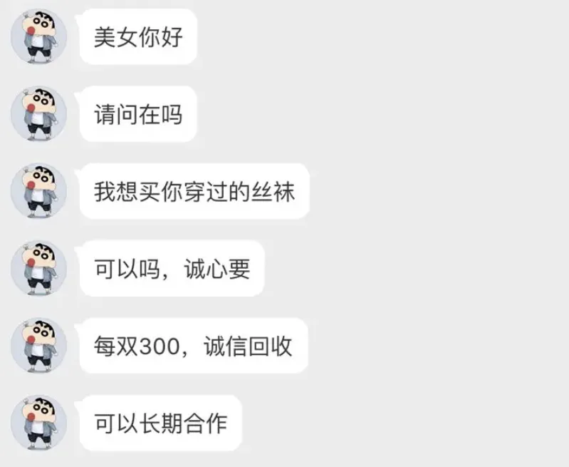 一类是低价的,开价几块、几十块,装作无害地说“能不能收一双你穿过的袜子”,这种人大概率是真有癖好,买回去收藏、闻、甚至别的什么操作。