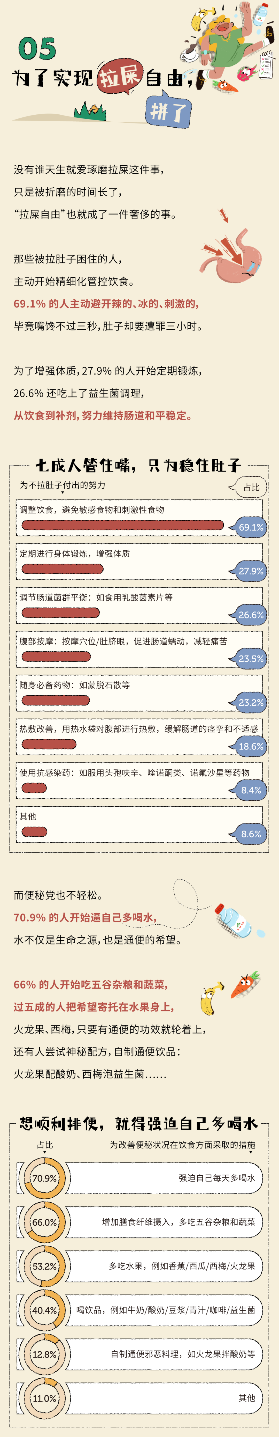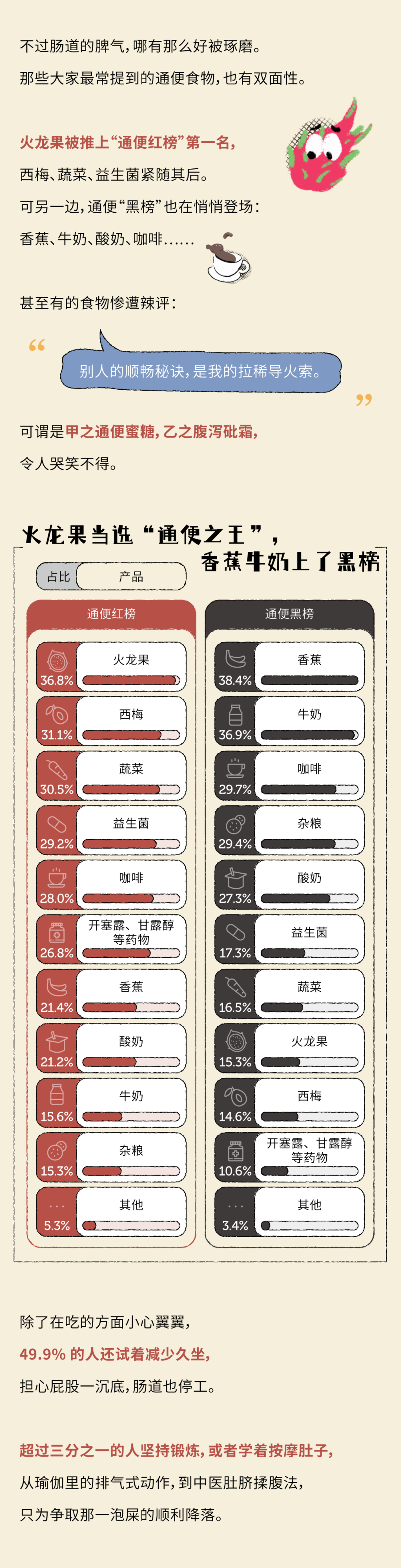 并且在拉屎这件事上,人类永远有新的玄学课题要面对。为了通畅一点,大家开始研究食谱、比对心得,西梅、火龙果、香蕉,到底哪个才真的灵?