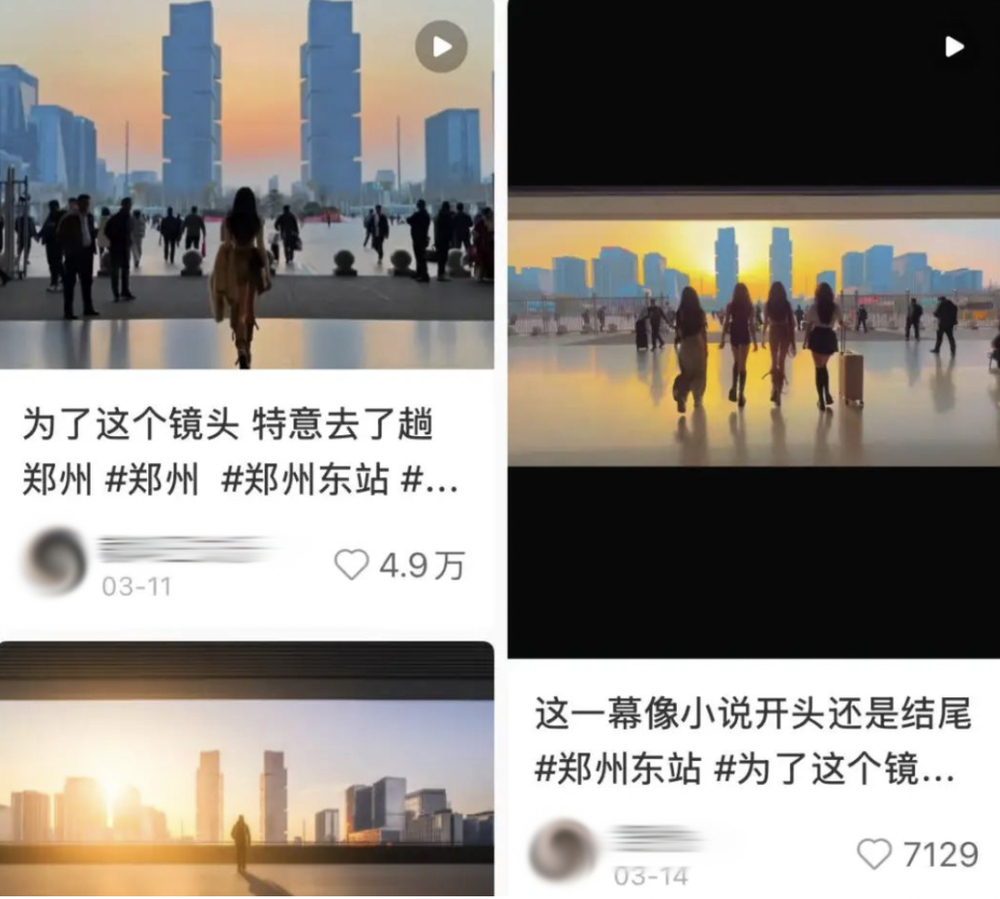 比如前段时间爆火的A市霸总打卡机位,视频里,西装革履的顾总们向前走出大门,映入眼帘的是自家十几位数的产业,而这里实际上是郑州东站西广场的大门。