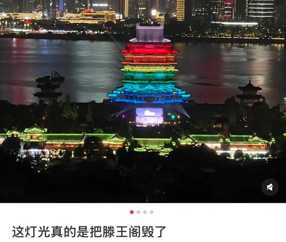 但审美就是这样,时不时会出现滑坡。比如滕王阁5月初的盛世配色,古风的黄绿变成了发廊彩虹配色,有人说这是红浪漫洗脚城南昌版,也有人说,这是上世纪80年代歌舞厅门口的彩灯被挂在了南昌人民的头上。