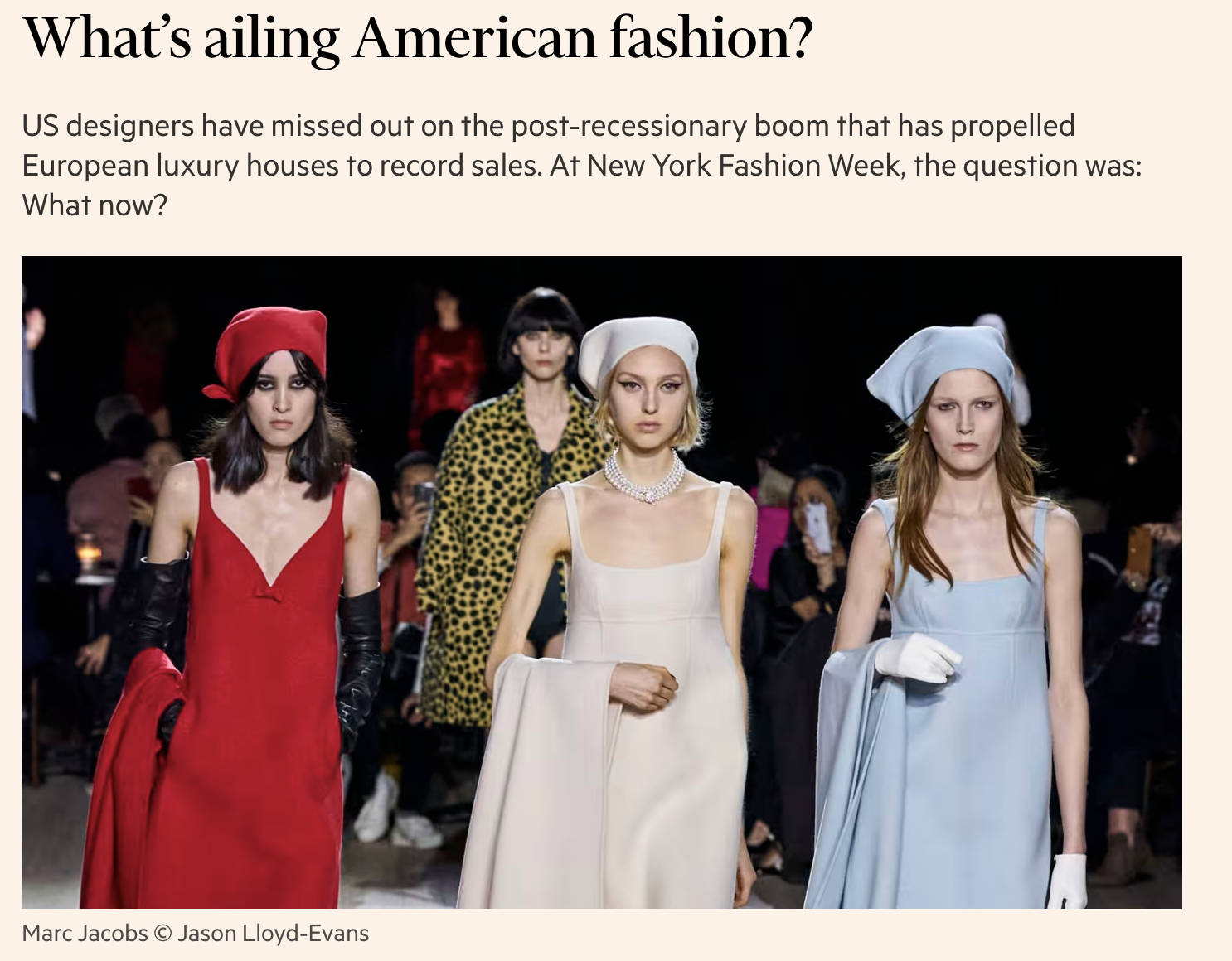 今天隐藏在美国时尚从业者身后那种淡淡的焦虑,英国金融时报在2020年名为《美国时尚界为何陷入困境?》的文章就直接指出: