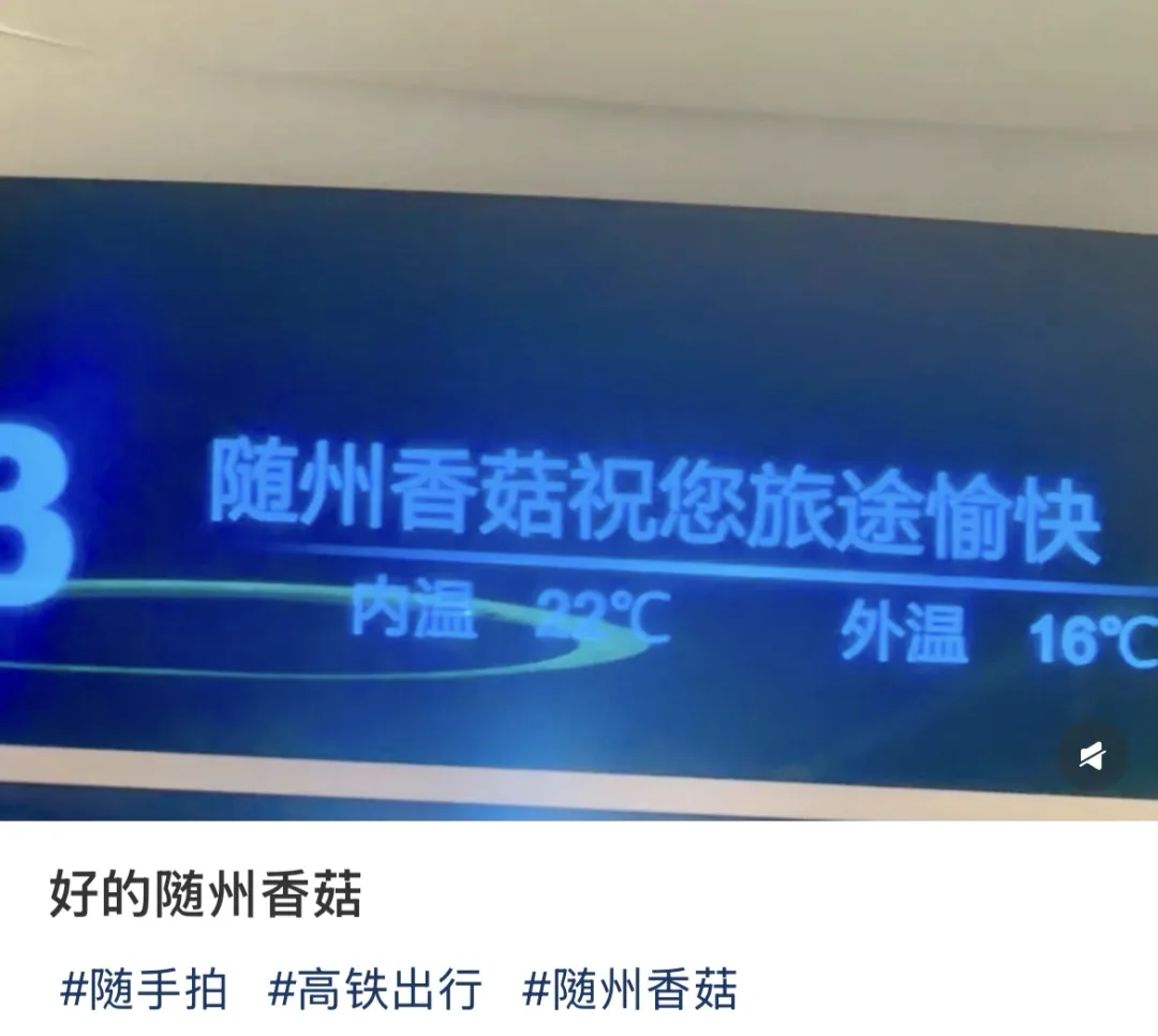 很少有地方像湖北随州一样,有创意到让不下车的过路旅客在高铁上就莞尔一笑。只因为那句疾驰车厢中,屏幕上高亮的“随州香菇祝您旅途愉快”。