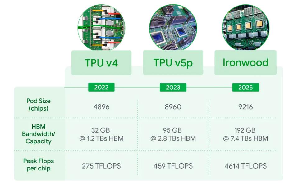 在单芯片规格上,Ironwood 显著提升了内存和带宽,每块芯片配备 192GB 高带宽内存(HBM),是去年发布的上一代 TPU Trillium 的六倍。每块芯片的内存带宽达到 7.2 terabits/s,是 Trillium 的 4.5 倍。